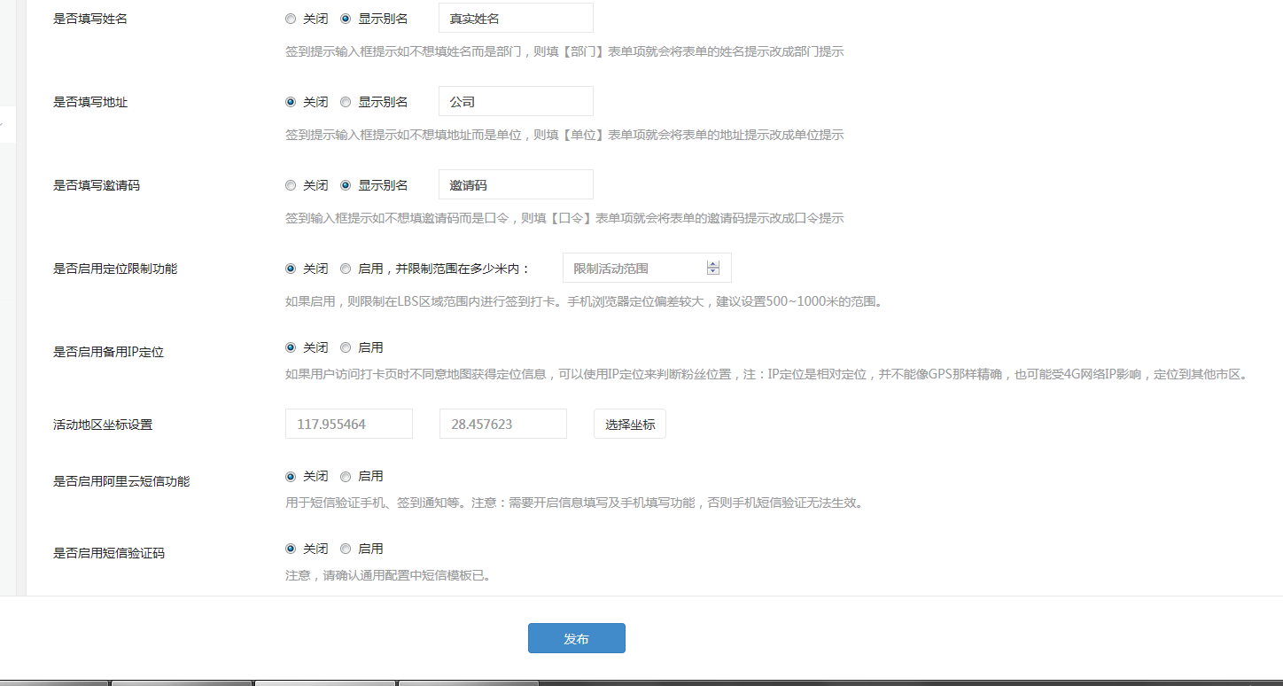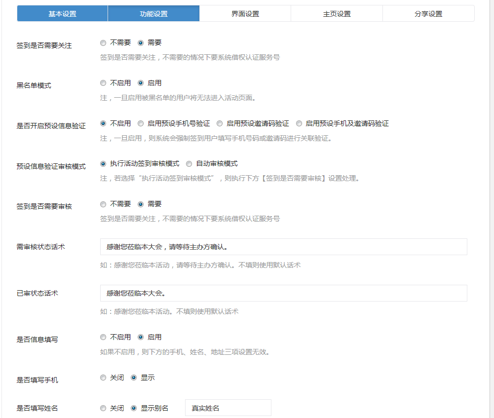 4、支持預(yù)設(shè)邀請簽到核驗內(nèi)容自定義,即可以開關(guān)參會人員提交的表單信息如可以開啟或關(guān)閉手機、邀請碼、姓名、地址等表單的填寫。同時還支持表單項標(biāo)題別名,如默認(rèn)姓名表單項改成 小組表單項目。那么參會看到的填寫表單項目就是 小組表單項。而且導(dǎo)出excel文件都是別名即導(dǎo)出的excel對應(yīng)表單項的別名標(biāo)題。如 昵稱、手機、小組等。