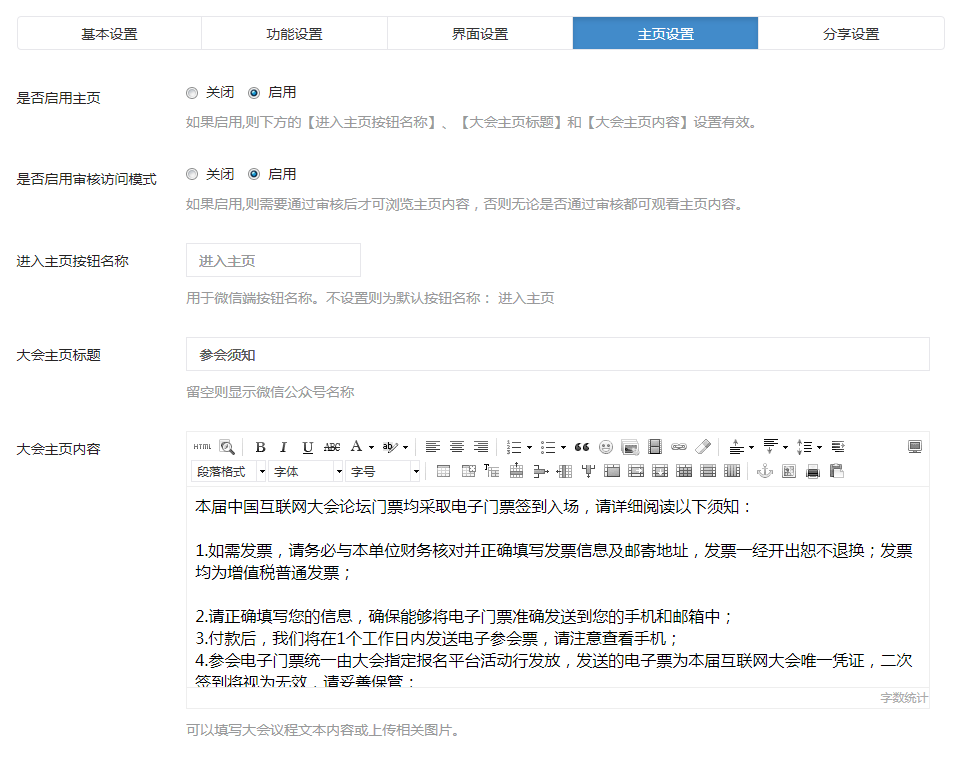 7、支持主頁開啟關(guān)閉及主頁內(nèi)容自定義,即簽到成功后參會人員可以看到會議的流程內(nèi)容、分會場主題內(nèi)容等會議手冊。如果你想設(shè)置的其他內(nèi)容如視頻、音頻、圖文等內(nèi)容都可以設(shè)置。也可以關(guān)閉主頁功能;
