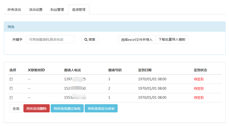 5、支持根據(jù)粉絲或根據(jù)預(yù)設(shè)邀請簽到情況導(dǎo)出excel表功能;