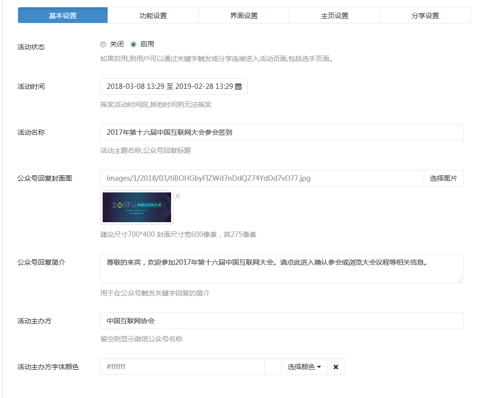 2、支持頁面元素自定義,如主辦方字體顏色、按鈕顏色、按鈕內(nèi)容、主頁內(nèi)容、背景、頭圖等;